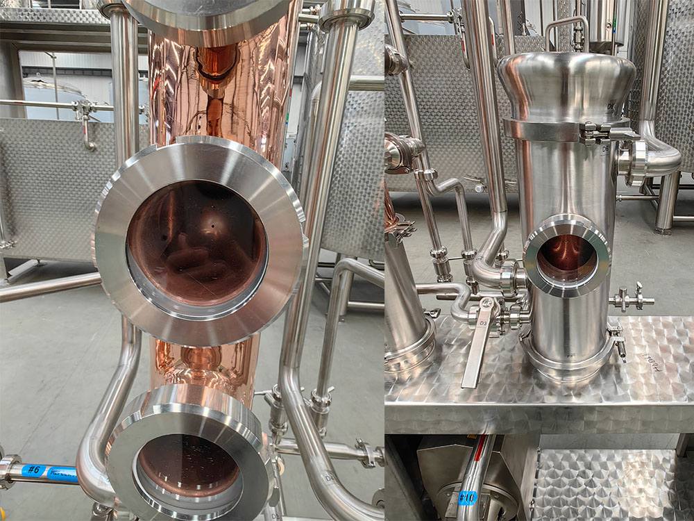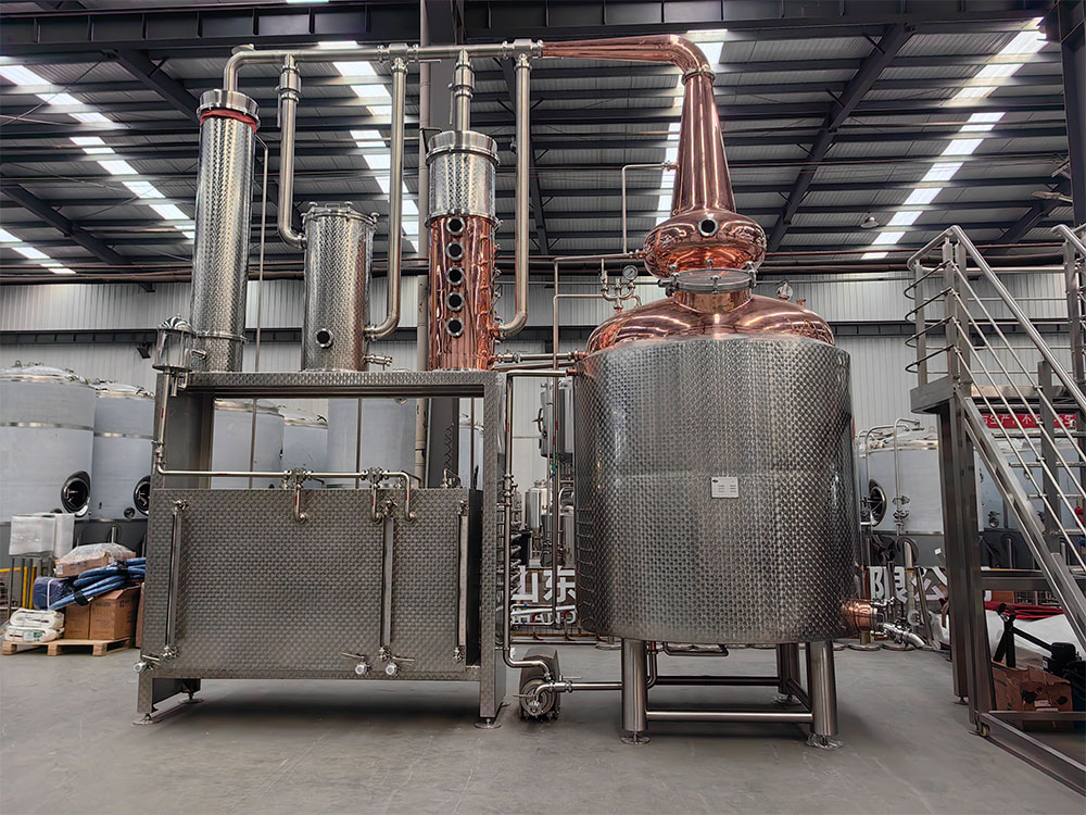 Cet équipement de distillerie comprend un pot de distillation de 4000 litres avec chauffage à la vapeur, un casque en cuivre, un col de cygne en cuivre et un bras de Lyne, une colonne de distillation en cuivre, un panier à gin en acier inoxydable, des réservoirs de réception d'alcool en acier inoxydable de 200 litres, 1500 litres et 500 litres, ainsi que le système de refroidissement, le système d'approvisionnement en vapeur, le système d'approvisionnement en eau et l'armoire de commande.