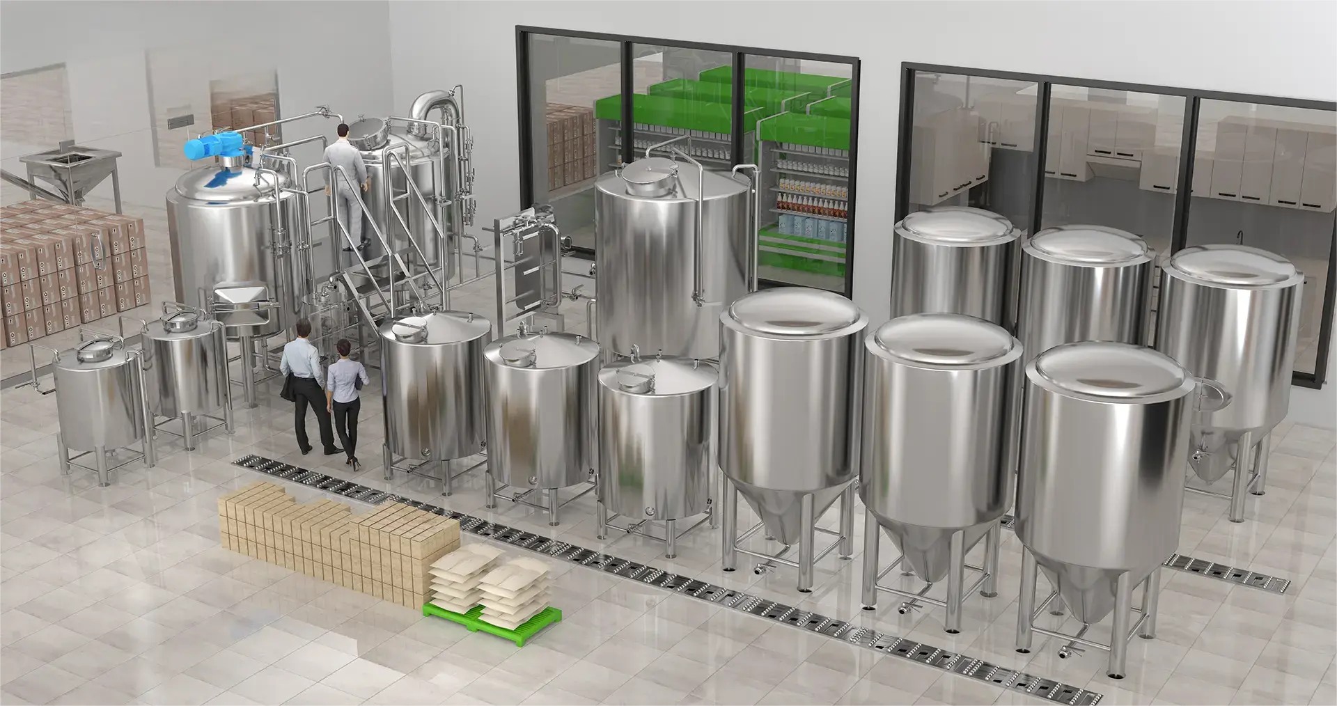 Tiantai conçoit et réalise des brasseries complètes, couvrant toutes les activités, de la manutention du malt au contrôle, du brassage à la fermentation, du filtrage à l'embouteillage et à l'emballage.