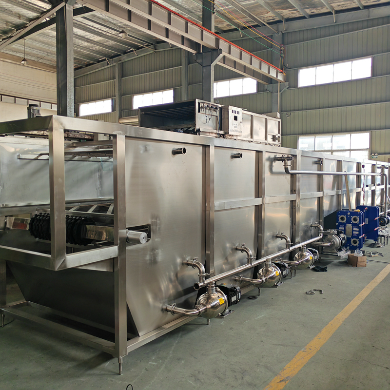 The system is equipped with three 10T/h warm water pumps and one 10T/h hot water pump, providing stable water circulation across the temperature zones. Temperature is precisely controlled using a DN40 pneumatic diaphragm valve, and the PLC-controlled electrical cabinet enables intelligent monitoring and easy operation. Bottles are smoothly transported through the system on inlet and outlet conveyor belts, with adjustable speeds ranging from 110 to 553 mm/min.