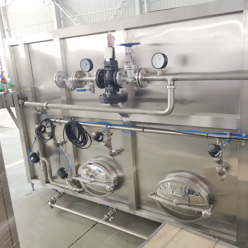 Heating is provided by 0.2–0.4 MPa steam, in combination with 6 m³ of circulating hot water, ensuring uniform thermal distribution throughout the sterilization zone. All components in contact with bottles and water—including the machine frame, conveyor belt, and spray nozzles—are made of SUS304 stainless steel, ensuring hygiene, durability, and corrosion resistance.