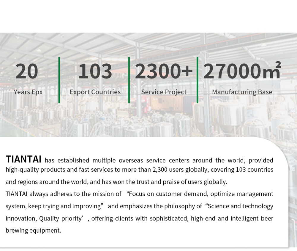 TIANTAI turnkey brewery plants offer innovative solutions and cutting-edge technology to help you achieve your brewing dreams. With Tiantai you can trust that your brewery project will be in expert hands from start to finish. As a general contractor, Tiantai supplies turnkey solutions for the entire brewery. We manufacture precisely matched brewery systems developed according to energy and economic aspects. With our decades-long experience in integrative systems construction, we have successfully completed a multitude of turnkey projects all around the globe.