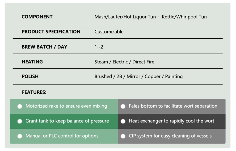 | Kettle Tun | 500L (total 650L) | Steam Heating/Electric Heating/Direct Fire Heating for option | ||